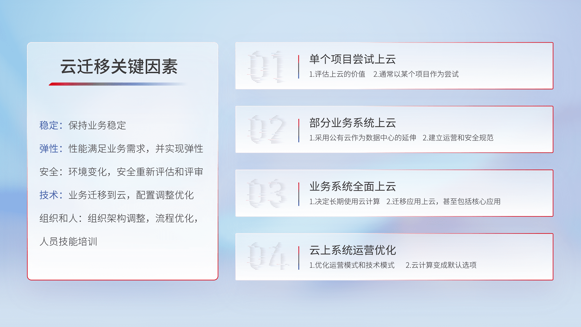 结合实际业务,,,,从规划设计、、、、云平台选型、、、、云原生改造、、数据迁移、、、、集成交付,,,,迁移全过程为客户识别最佳上云路径,,做好风险识别管理,,,设计网络架构、、、、身份权限、、、、安全审计合规、、、操作审计、、、、日志审计、、、监控告警策略、、、、多站点容灾设计等,,,,对云上基础设施进行整体规划,,,提升IT治理水平,,,以满足弹性、、、、高可用、、、高性能的需求。。。。